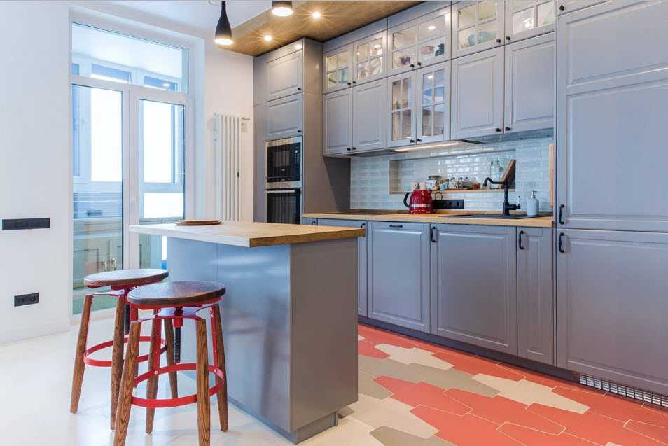 Цвет полов не должен привлекать внимание, подбирайте его под общее обустройство кухни. Для пола в узких кухнях очень актуальны: