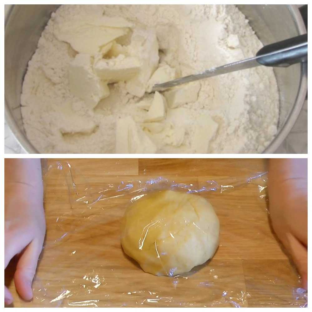 По технологии он очень похож на предыдущий, но для упрощения процесса, мы масло смешаем с мукой, а для основы приготовим другое пресное тесто. Все продукты должны быть холодными, в кухне тоже идеально чтобы было прохладно.