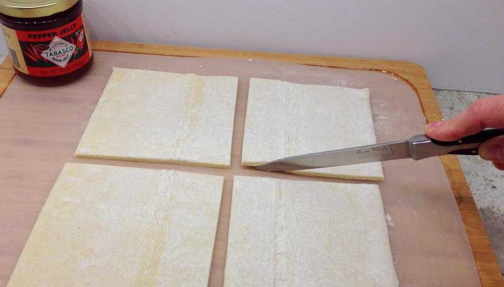 Слоёное тесто размораживаем и раскатываем в пласт толщиной около половины сантиметра.