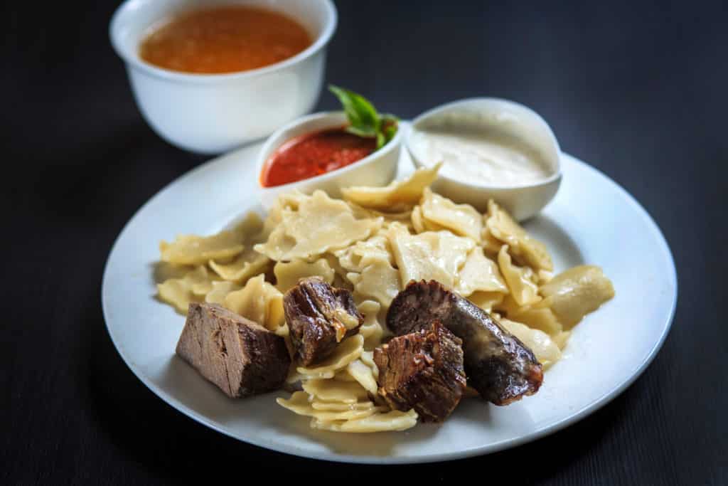 - Вынимаем готовые кусочки теста из бульона шумовкой и раскладываем по тарелкам. Сверху кладем кусочки нарезанного мяса, по несколько ложек томатно-чесночного соуса и сметаны. Отдельно в пиалах подаем бульон. Его можно посыпать небольшим количеством измельченной зелени. Приятного аппетита!