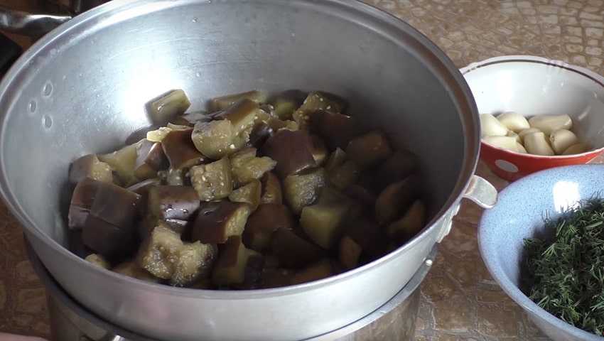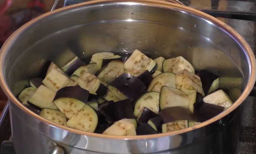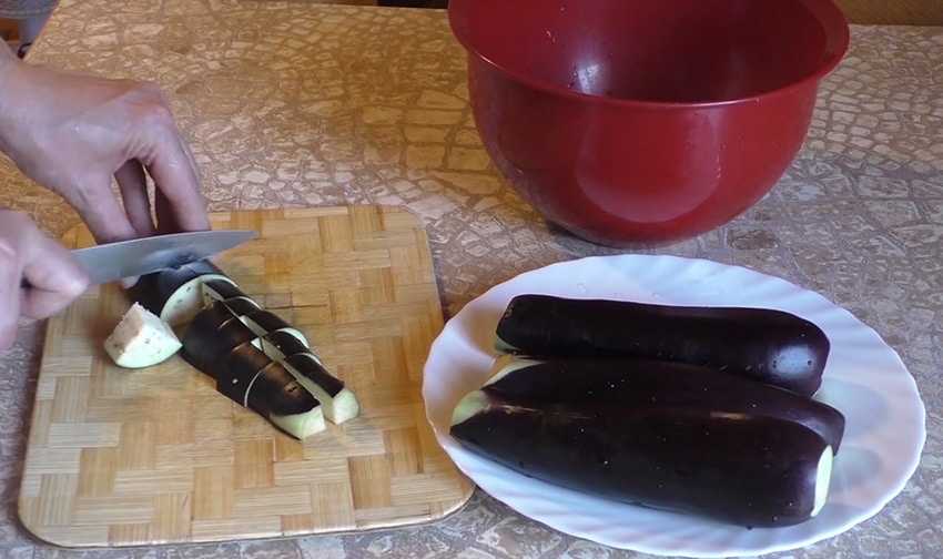 - Варенные в соленой воде , стекшие баклажаны нарезают крупно поперек