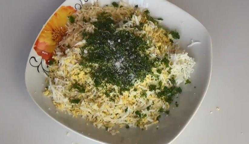 Натереть сыр и отваренные яйца на мелкой терке. Добавить соль, перец и мелко нарубленную зелень.