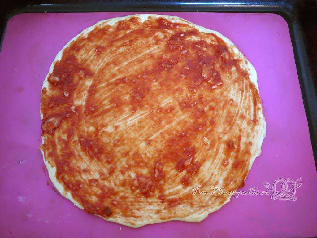 Смазать будущую лепешку томатным соусом.