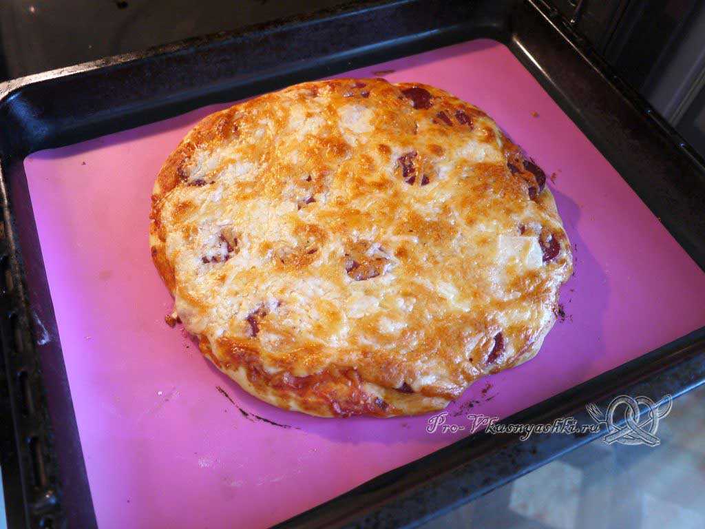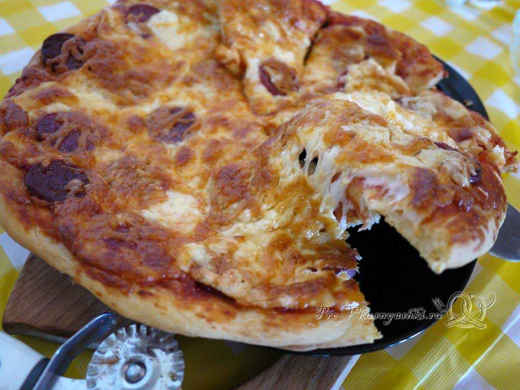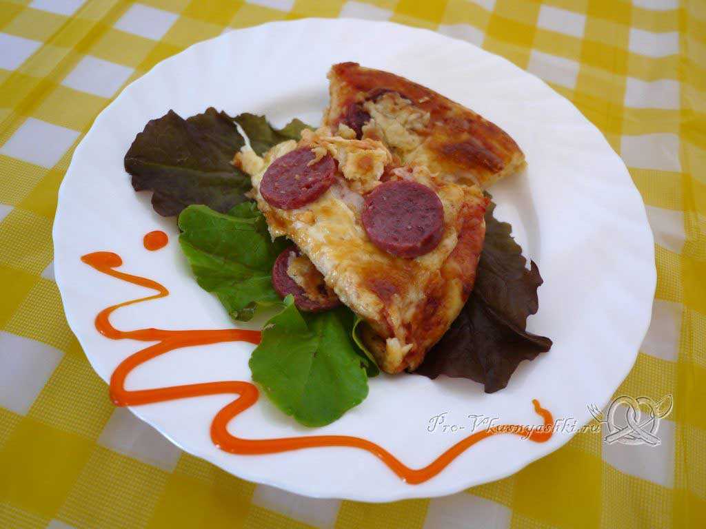 Тесто пиццы по этому рецепту получается очень мягким и даже после остывания блюда не теряет своей пористости и нежности, а само изделие выходит очень сочным за счет выделившегося из колбасы жира.