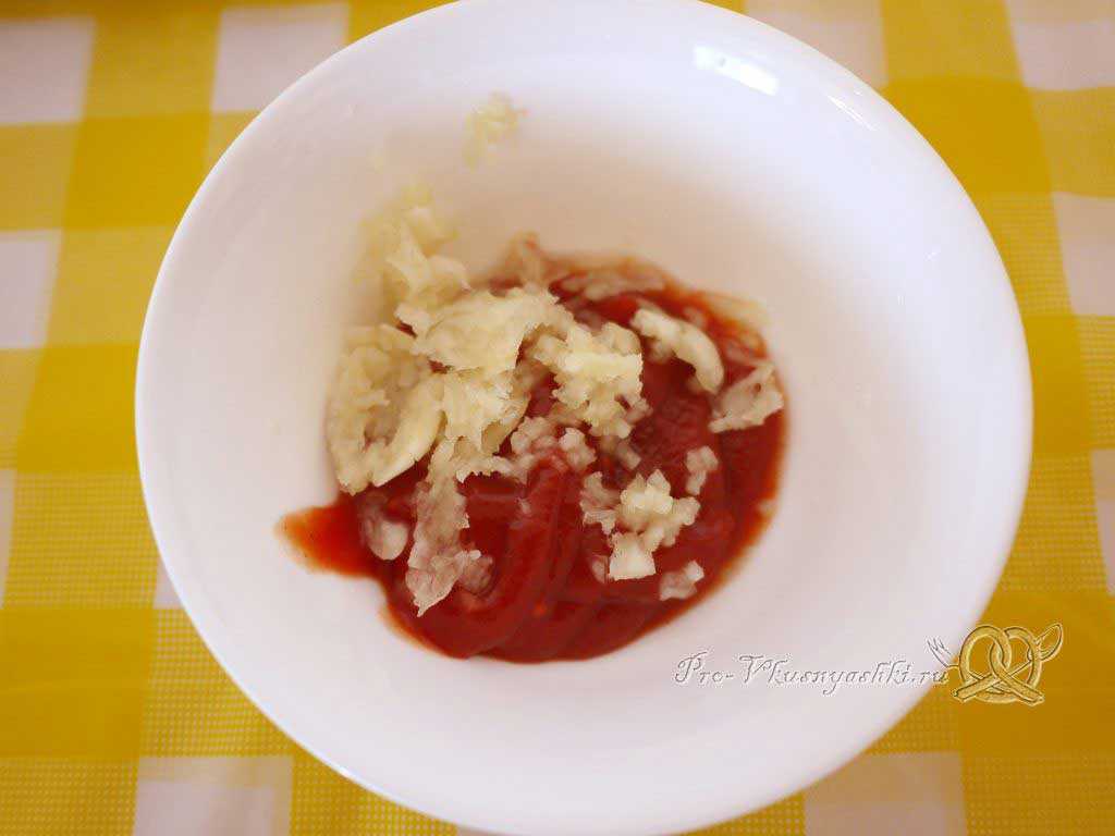Чеснок (2 зубчика) пропускаем через пресс и соединяем его с кетчупом (50 г).