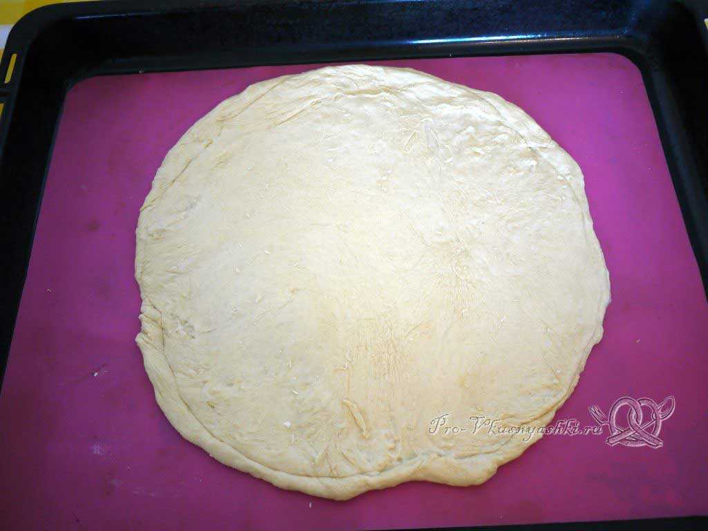 - Аккуратно скалкой раскатываем готовое дрожжевое тесто. Оно должно получиться тонким и круглым по форме. Получившийся «блинчик» выкладываем на разогретый противень. Смазываем тесто соусом, наверх кладут кружочки колбасы, за несколько минут до полного приготовления все это обильно посыпаем сыром.