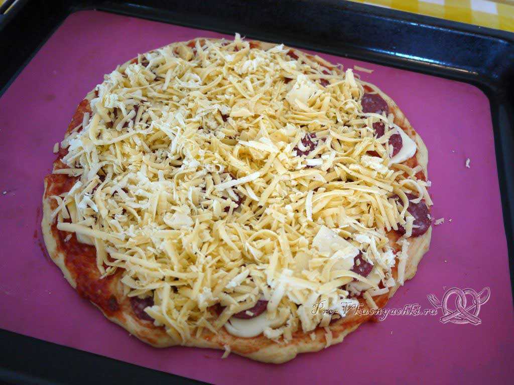 Посыпаем сырной стружкой всю поверхность пиццы.