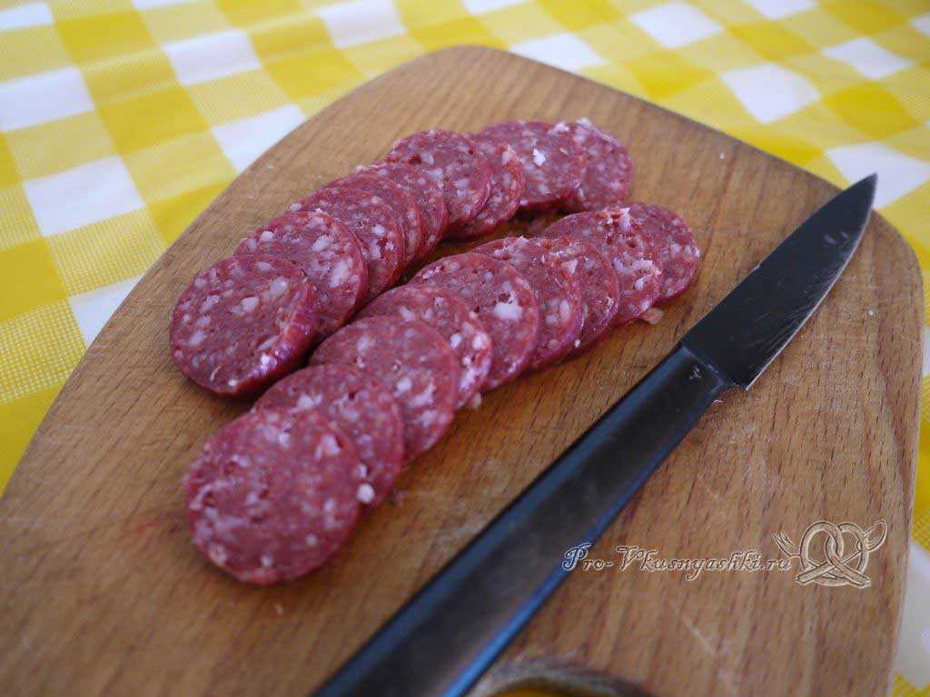 Сырокопченую колбасу нарезаем тонкими слайсами.