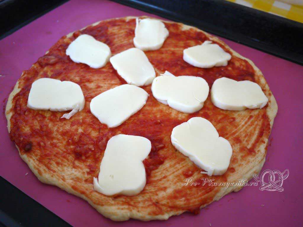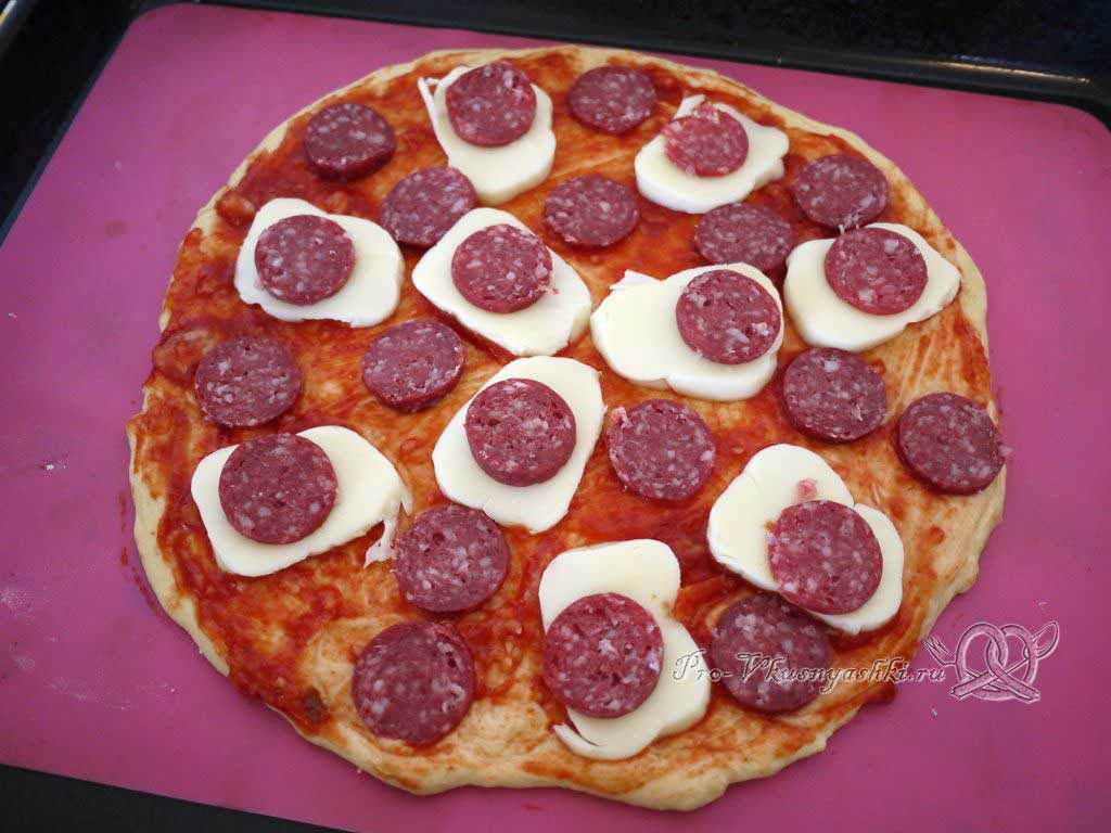 Поверх соуса выложить сначала моцареллу, затем пепперони.