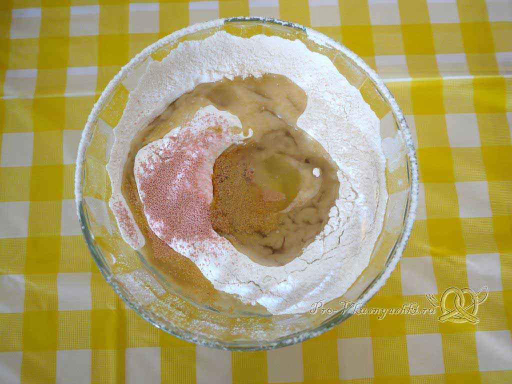 - Добавляем в эту же посуду дрожжевую смесь, доливаем полстакана воды.