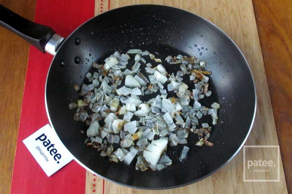 Репчатый лук чистим, нарезаем маленькими кубиками и обжариваем до прозрачности на подсолнечном рафинированном масле.