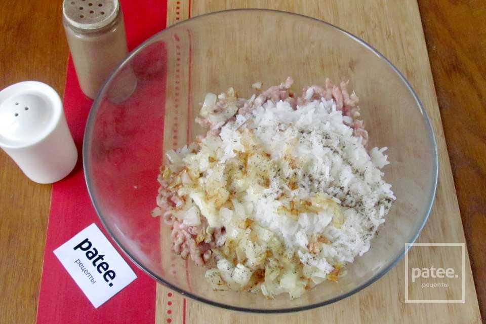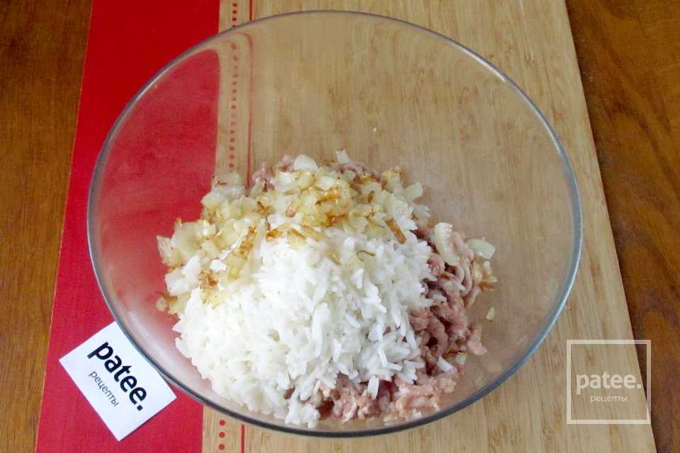Круглый рис отвариваем до готовности в подсоленной воде, откидываем на дуршлаг, а когда вода стечёт, перекладываем вместе с жареным луком в миску со свиным фаршем. В ингредиентах указано количество сырого риса.