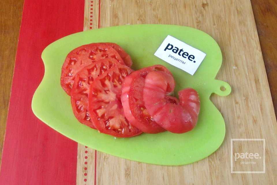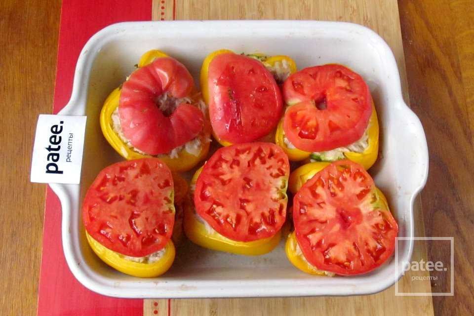 Раскладываем на каждую половинку перца по кружочку помидора.