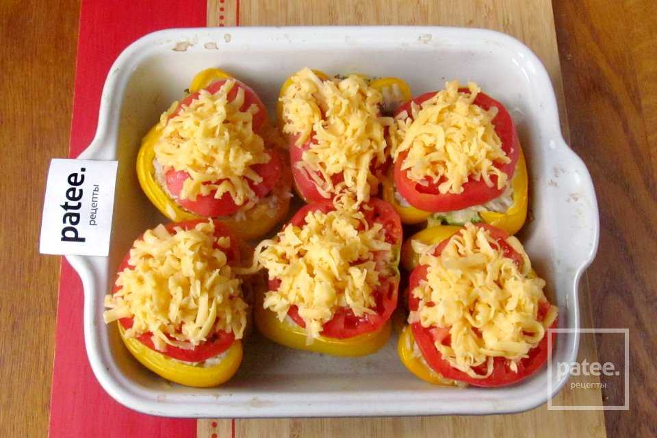 Перец фаршированный половинками в духовке с помидорами и сыром готов!