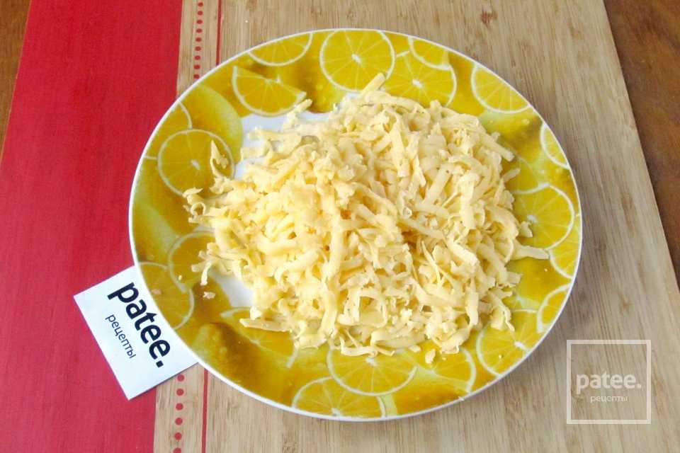 Сыр измельчите с помощью средней или крупной терки. Для того чтобы избежать прилипания и ускорить процесс готовки, слегка смочите инструмент прохладной водой, а сыр предварительно нарежьте на кусочки, которые будут легко помещаться вам в руку.