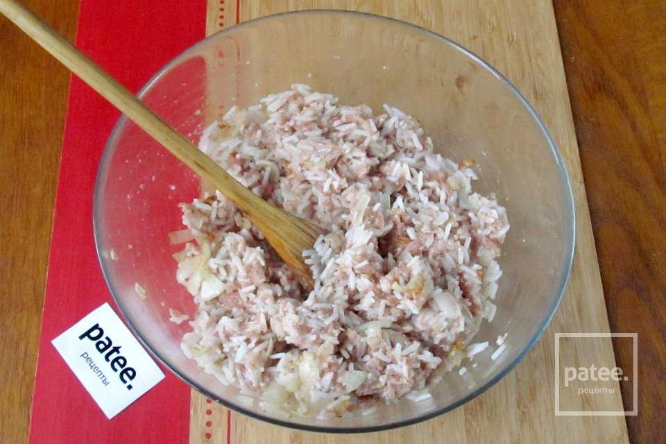 1.Отварите рис, но не до полной готовности. Пусть он будет немного твердым и рассыпчатым. Смешайте его с подготовленным фаршем из курицы (можно просто ножом мелко порубить филе), посолите и поперчите по вкусу.