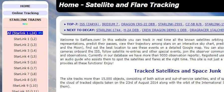 Перейдите в раздел Starlink Trains и выберите, за какой серией спутников вы хотите наблюдать. Например, Starlink 1 были запущены 24 мая 2019 года, а Starlink 24 — 24 марта 2021 года. Можно выбрать для наблюдения все серии.