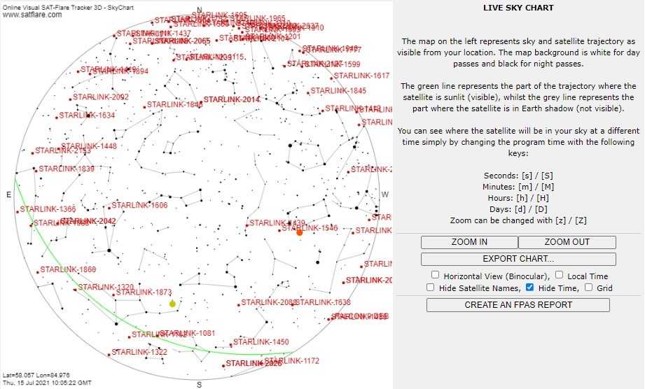 На satflare.com есть звездная карта. Она показывает движение устройств Starlink на небе относительно выбранного местоположения. Зеленые линии — траектории хорошо заметных спутников. По серым движутся те, которых почти не видно.