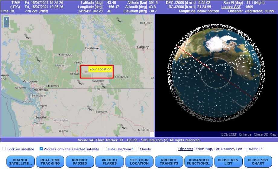 - местные дата, время и период, когда спутник будет виден, — возможны погрешности около 10 минут;