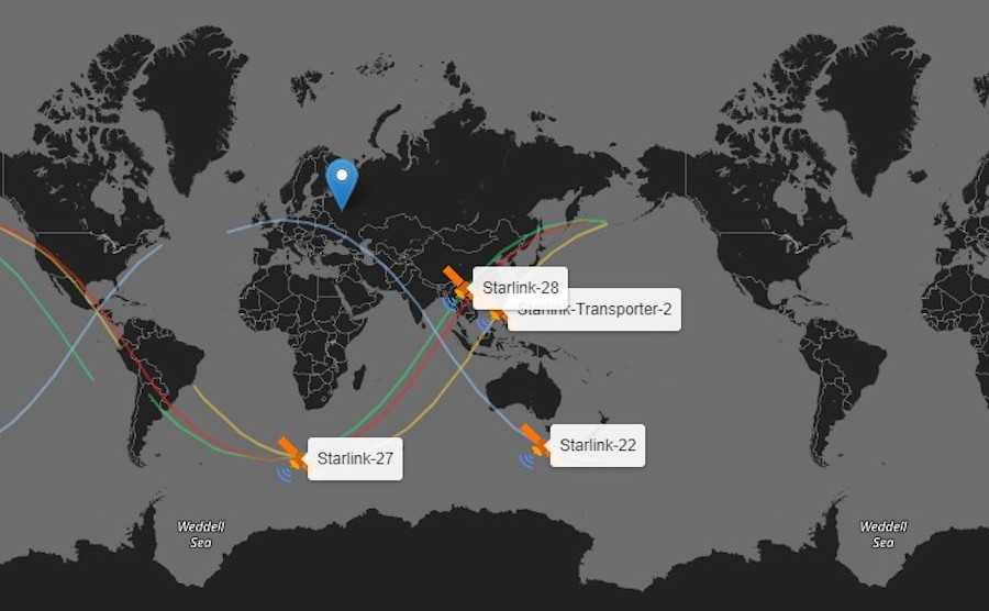 На 2D-карте можно наблюдать за устройствами Starlink в реальном времени. Спутники перемещаются не поодиночке, а группами из 30–40 устройств. Но сайт показывает только первый прибор из каждой серии, чтобы не перегружать систему. Разработчики предупреждают, что данные могут быть неточными, так как траектории движения часто меняются.