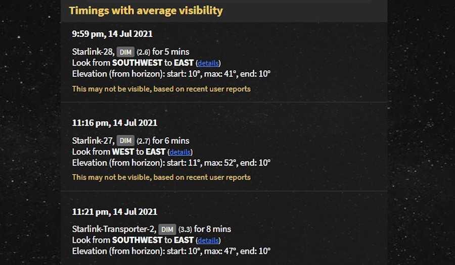 Find Starlink — англоязычный сервис от анонимных разработчиков, который предсказывает, когда именно в течение следующих пяти дней можно будет увидеть спутник. Введите свои страну и город (либо точные координаты), затем нажмите на кнопку Find Visible Times.