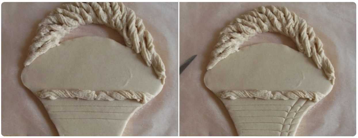 - Подготовьте шаблон корзины и, приложив к тесту, вырежьте корзину их него