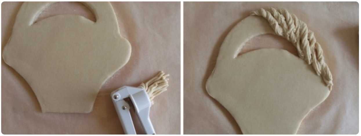 - Выдавите тесто с помощью чеснокодавилки, скрутите его в жгутики, прилепите его, смочив перед этим место соединения, на ручку вашей будущей корзинки.Можете добавить жгутики и на ободок