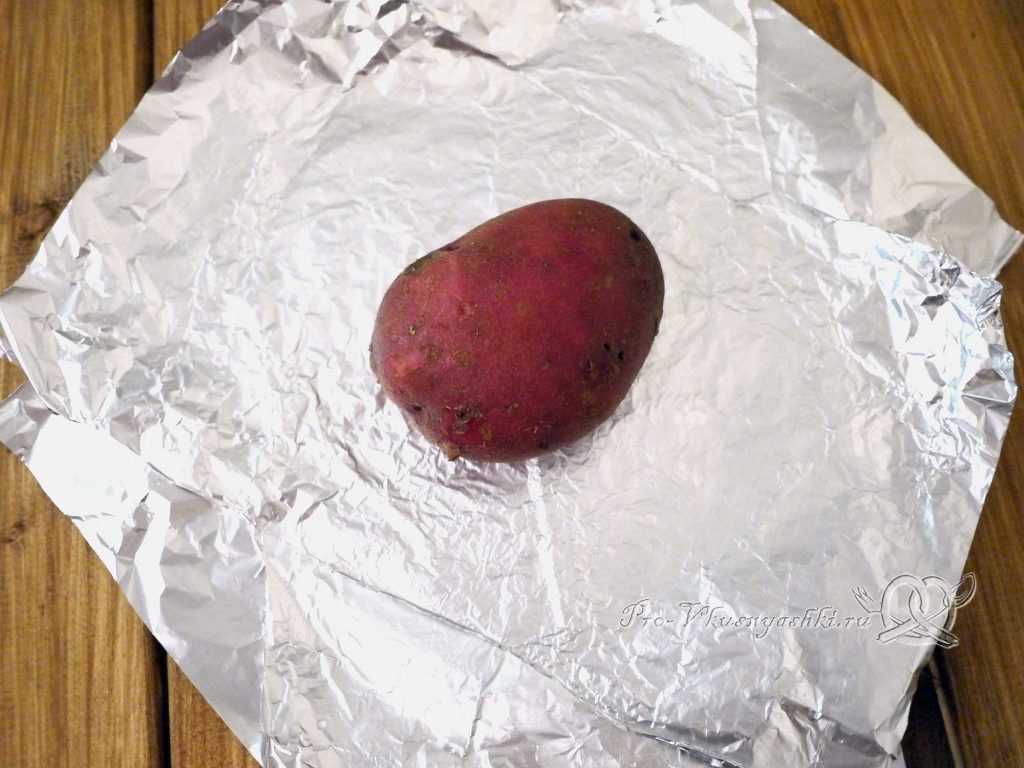 Фольгу нарезаем на части примерно в 4-5 раз большие размера картофеля. Складываем листы один на другой в 2-3 слоя. Блестящую поверхность верхнего слоя смазываем маслом, кладем на нее сырой овощ и аккуратно заворачиваем так, чтобы фольга полностью покрывала клубень.