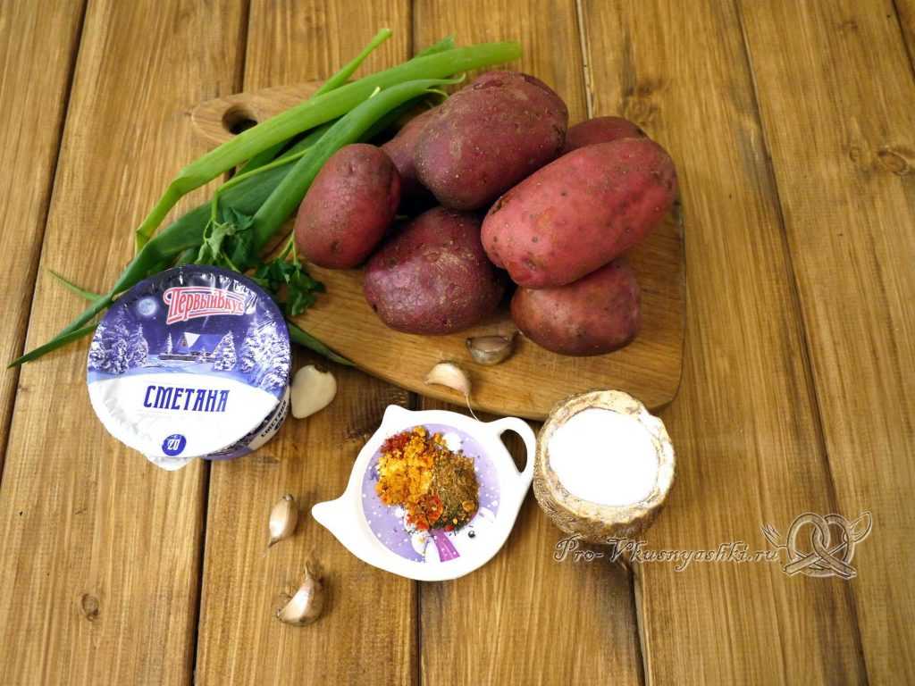 Разберемся с ингредиентами. Картофель тщательно моем, затем вытираем насухо тряпочкой. С чеснока снимаем шелуху, зелень споласкиваем под струей воды и обсушиваем на полотенце.