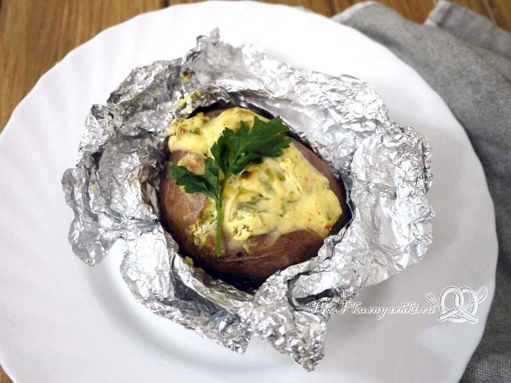 Подаем готовый картофель прямо в фольге, так блюдо дольше сохранит тепло. А есть его лучше чайными ложками, аккуратно извлекая мякоть и соус из мундира.