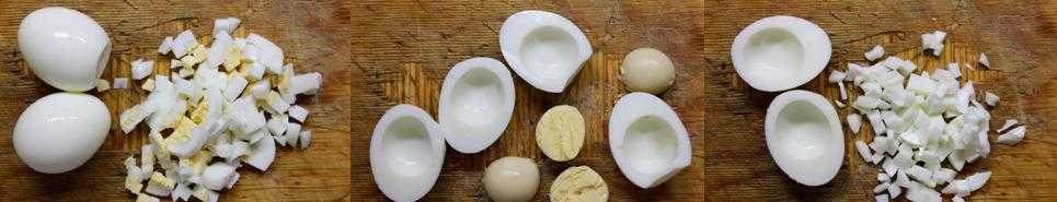 2. Яйца очистите и одно из яиц накрошите мелко кусочками. Два остальных яйца разрежьте на пополам, для того, чтобы отделить белок от желтка. Белок порубите на кубики. А желтки уберите в сторону, они пригодятся для соуса.