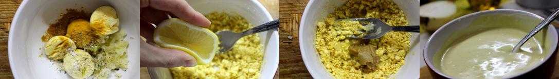 4. Приготовьте соус. Желтки от яиц смешайте с куркумой, выдавите из лимона сок примерно 1 ч.л. Далее внесите туда измельченный чеснок, соль, горчицу и перец. Все тщательно вымешайте. Заправьте соус оливковым маслом и кефиром. Получился соус напоминающий домашний майонез собственного приготовления.