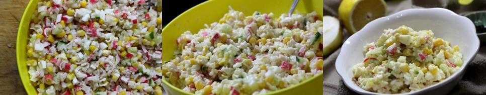 Как говорится, классические салаты всегда были и есть в моде. Я знаю, два варианта классического вида с кукурузой и огурцом. В первом варианте не будет использоваться рис, т.е блюдо будет с крабовыми палочками, кукурузой и с огурцом, но без риса. А во втором варианте будет присутствовать рис и приготовленный в домашних условиях соус для заправки.