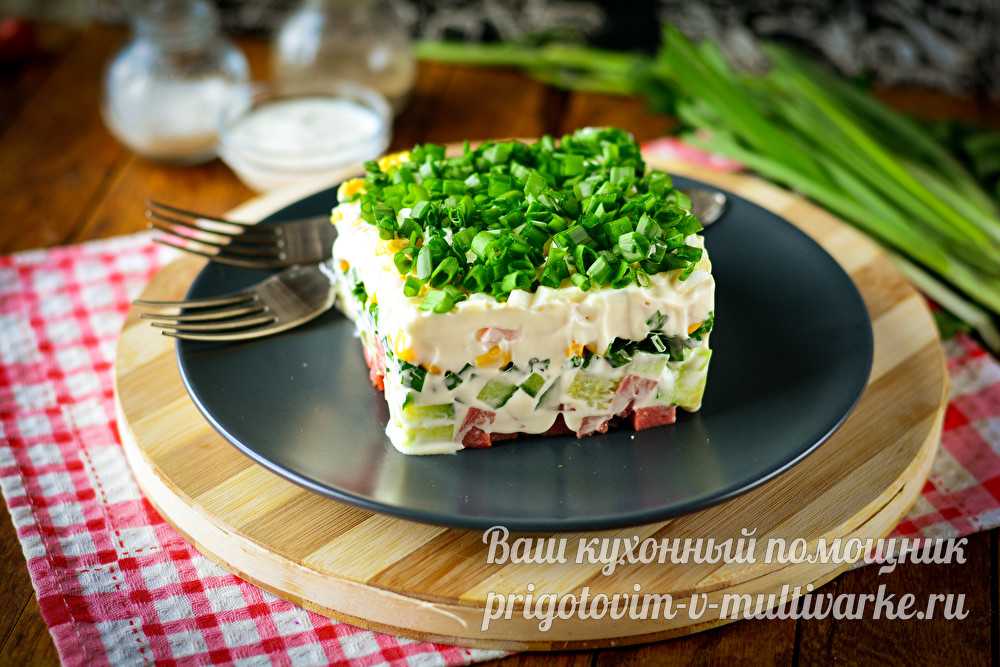 - можно резать тонкой соломкой. В этом случае огурцы мы режем также. А яйцо, кукуруза и зеленый лук будут иметь форму кубика. «Геометрия» внешнего вида будет другой.
