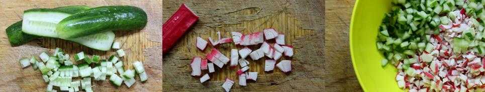 1. Порежьте при помощи кухонного ножа мелко свежий огурец, крабовые палочки и выложите их в одну чашу.