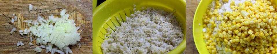 3. Для ароматности добавьте в чашу резанный мелко репчатый лук. Рис отварите в соленой воде, слейте всю жидкость через друшлаг и добавьте его к остальным ингредиентам.