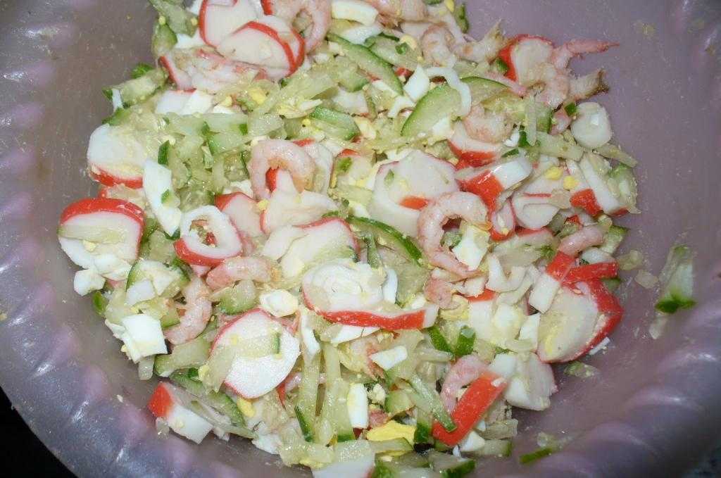 Салат с крабовыми палочками, рисом, свежим огурцом, консервированной кукурузой и креветками