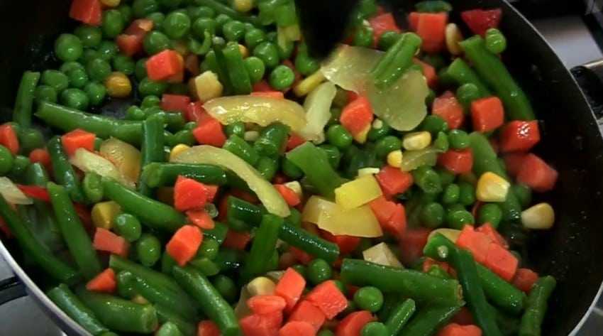 1. Мексиканскую смесь обжарьте на растительном масле и оставьте томиться под крышкой до готовности.
