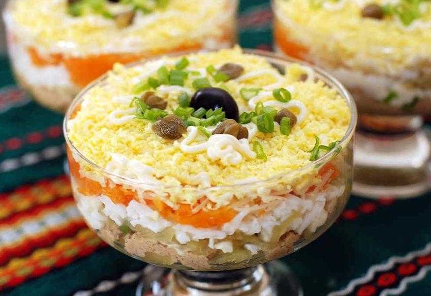 Сегодня я решила сделать для вас, да и для себя тоже, подборку рецептов таких салатов. Мне очень нравится идея подачи закуски к праздничному столу в стеклянных бокалах-креманках. Почему именно стеклянных? Потому что в них видны ингредиенты, а салаты в вазочках часто выкладывают слоями. Это интересно гостям, да и выглядит весьма аппетитно