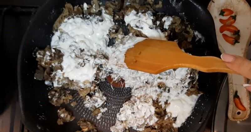Если масса сильно загустела, то можно добавить немного воды и продолжить процесс тушения в течение 3 минут. Затем добавляем сметану, желательно выбрать продукт с высокой жирностью.
