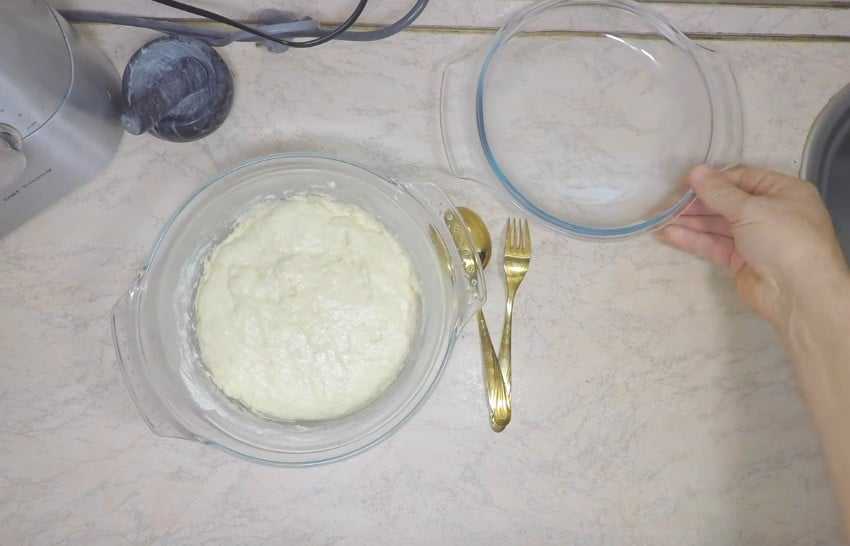Следующим шагом, нам необходимо тщательно смешать все ингредиенты, которые находятся в посуде. А потом, накрыть нашу ёмкость: либо полотенцем, либо пищевой плёнкой — тем самым дать возможность спокойно подойти опаре в течении минут тридцати — сорока. Из кулинарной практики, опара должна увеличиться вдвое. Это может произойти и раньше.