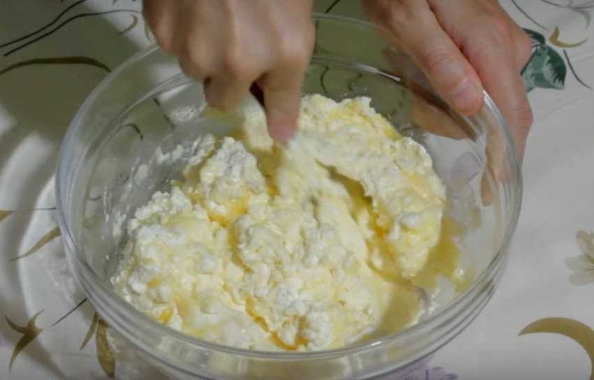 - Смешать яйцо, творог и молоко. В идеале молоко нужно наливать в последнюю очередь, чтобы тесто получилось не слишком жидким. Если все же вы перестарались с порцией, тогда можно добавить еще муки.