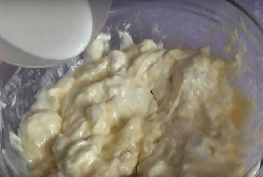 - Всыпаем остаток муки в сметанно-дрожжевую смесь, тщательно размешивая венчиком до однородности.