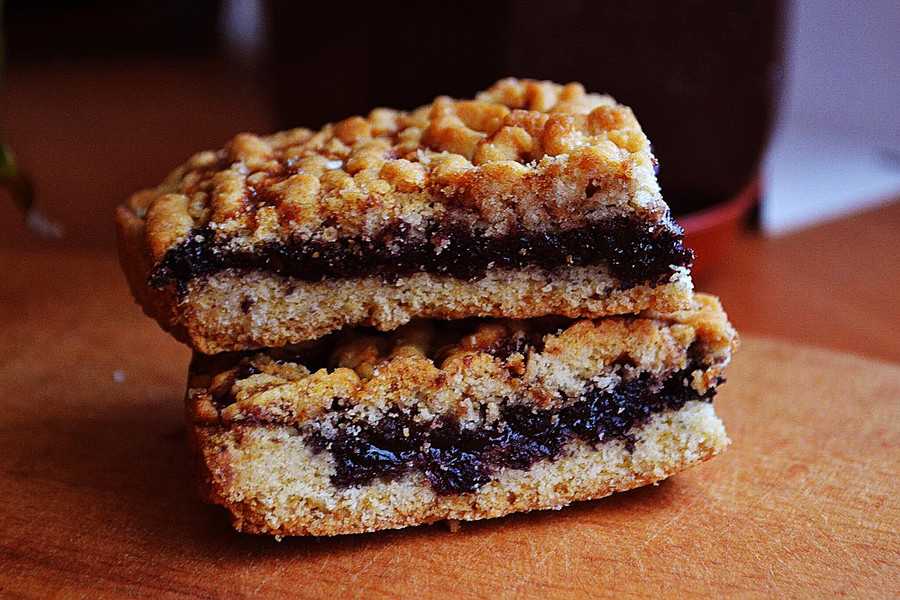 В форму для выпекания помещаем 2/3 песочной крошки, разравниваем тесто и прижимаем. Сверху на песочную крошку выливаем начинку, перемешанную с вареньем или без него. Последний слой будет из оставшейся части песочного теста.