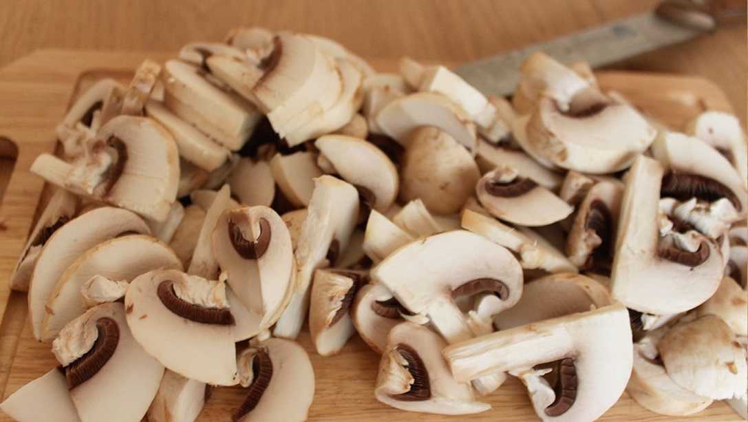 Теперь очередь за начинкой: порежьте тонкими кружками салями, оливки и шампиньоны, а также на мелкой терке необходимо заранее натереть сыр.