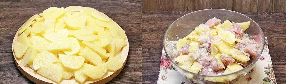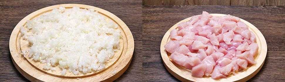 - Чистим лук и картошку. Картошку режем небольшими дольками, а лук – кубиками, смешиваем с курицей. Чем мельче вы нарежете все ингредиенты, тем быстрее испечется пирог.