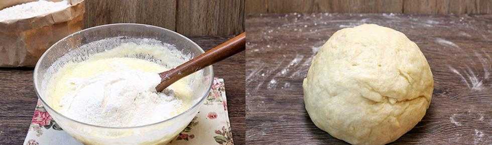 Хорошо перемешайте все ложкой, после того, как вы дойдете до того момента, когда столовой ложкой не будет удобно помешивать, выложите мучную массу на стол и вымесите тесто. Оно должно быть мягким и упругим и абсолютно не липнуть к ладошкам рук. После замеса, отправьте его в холодильник на часок, обернув пищевой пленкой.