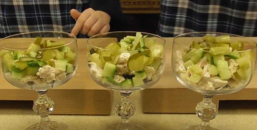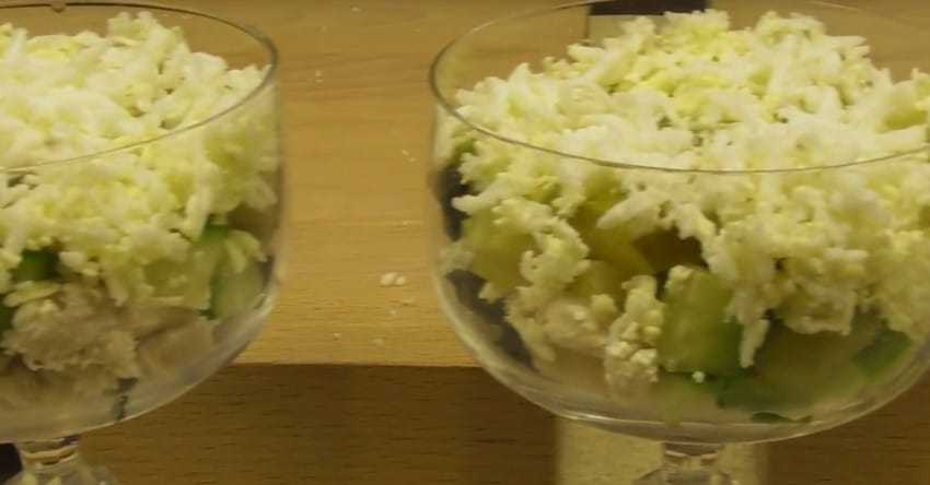 - Следующим слоем положите мелко нарезанные огурцы. Часть их можно оставить на украшение салата.