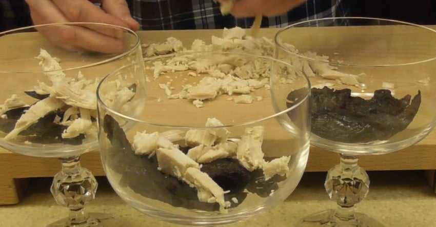2-й слой – отварное куриное мясо измельчаем с помощью блендера. Укладываем мясо в форму, разравниваем, покрываем майонезом.
