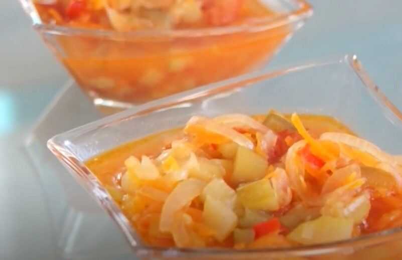 Три килограмма кабачков нарезают кусочками, морковь натирают на терке, измельчают колечками лук, перец — соломкой.